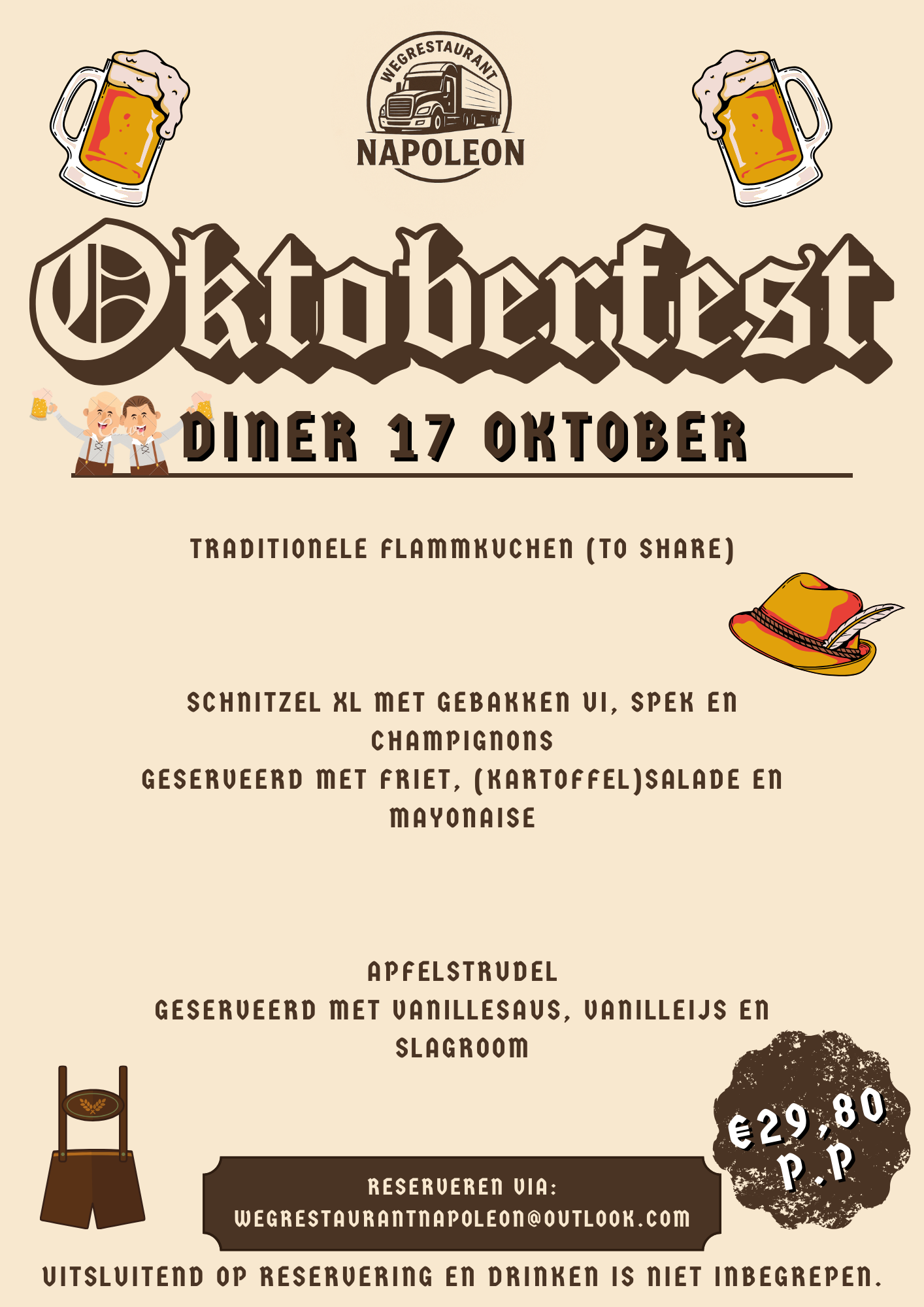 Vrijdag 17 oktober 2025: Oktoberfest diner | Inloop is tussen 17:00 – 18:00. Het diner wordt vanaf 18:15 gereserveerd.